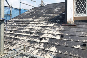 黒い塗膜がボロボロと剥がれ落ち、白い素地が見えてきてしまっています。このまま劣化が進むと、雨漏りなどがおきてしまう原因となるのです。そうなる前に、塗装をすることでさまざまな被害からお家を守ってくれます。