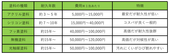 一般的に耐久性や耐候性が高い塗料は高額になる傾向にあります。また、遮熱性や防汚性、防カビ性などの機能を併せ持つ塗料は、その分、高額になります。
