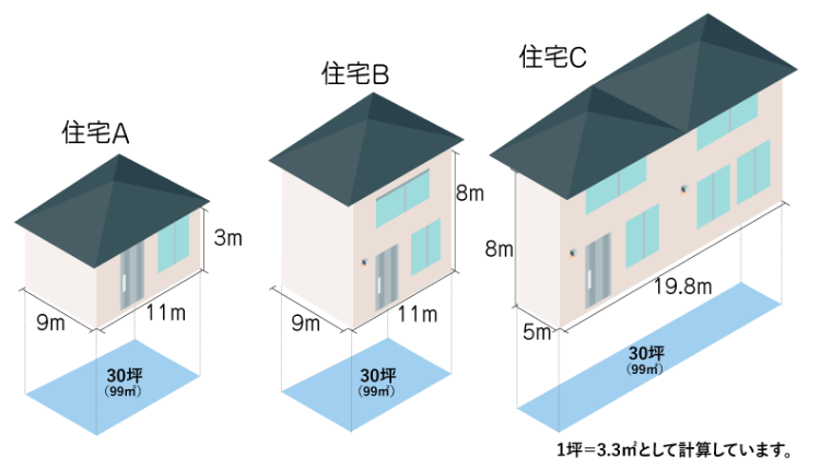 同じ30坪住宅の「住宅A」「住宅B」「住宅C」の塗装面積を算出してみると…
