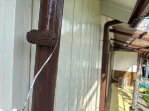 下塗り作業も終わり、次に屋根・雨樋の中塗り・上塗り作業にうつってまいります!