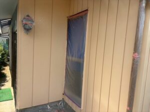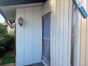 窓ガラスなどに塗料が飛散しないように、養生をしっかりとしてから塗装をしてきます。