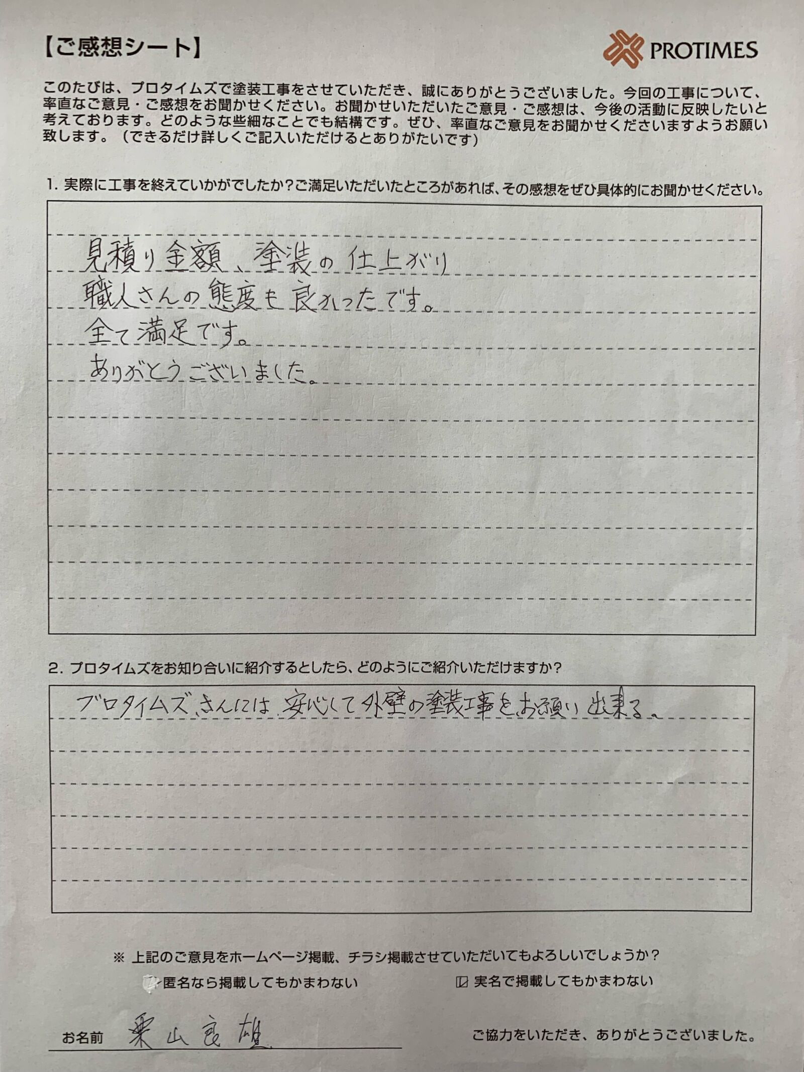 プロタイムズさんには、安心して外壁の塗装工事を、お願い出来る。