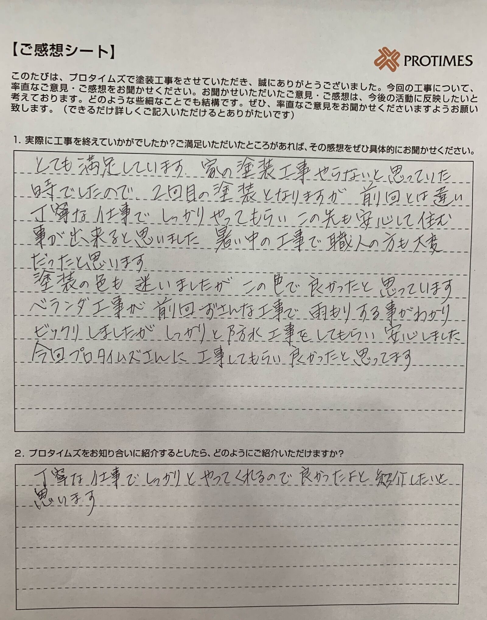 とても満足しています。家の塗装工事やらないとと思っていた時でしたので、2回目の塗装となりますが、前回とは違い丁寧な仕事でしっかりやってもらい、この先も安心して住む事が出来ると思いました。暑い中の工事で職人の方も大変だったと思います。